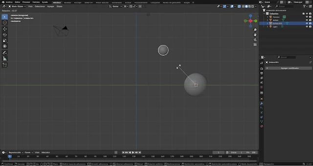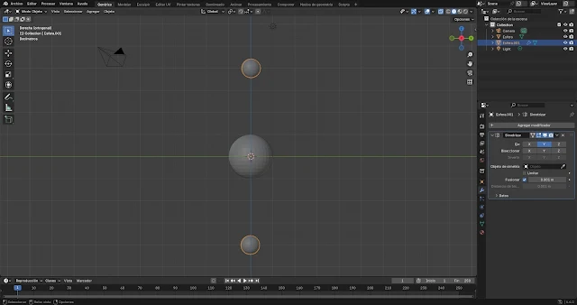 Primero, te voy mostrar un método que puede tener el mismo resultado pero que no es el adecuado porque nos daría problemas. Para este ejemplo, voy a usar dos esferas, pero se puede aplicar a cualquier forma.Seleccionamos la malla que va a orbitar y entramos en el Modo edición (Tabulador ⭾). Si no está seleccionado todo, pulsamos un vértice, arista o cara y lo seleccionamos todo (A). Ahora lo movemos fuera (G). Yo aprovecho el eje Y y, después de darle a la G para mover, pulso Y para desplazarlo en ese eje. ¿Qué hemos logrado? Si volvemos al Modo objeto (Tabulador ⭾) veremos que el origen (🟠) de la malla modificada se ha quedado donde estaba, mientras los vértices están donde los hemos colocado. Si rotamos o escalamos, veremos que tiene este origen como punto de referencia.